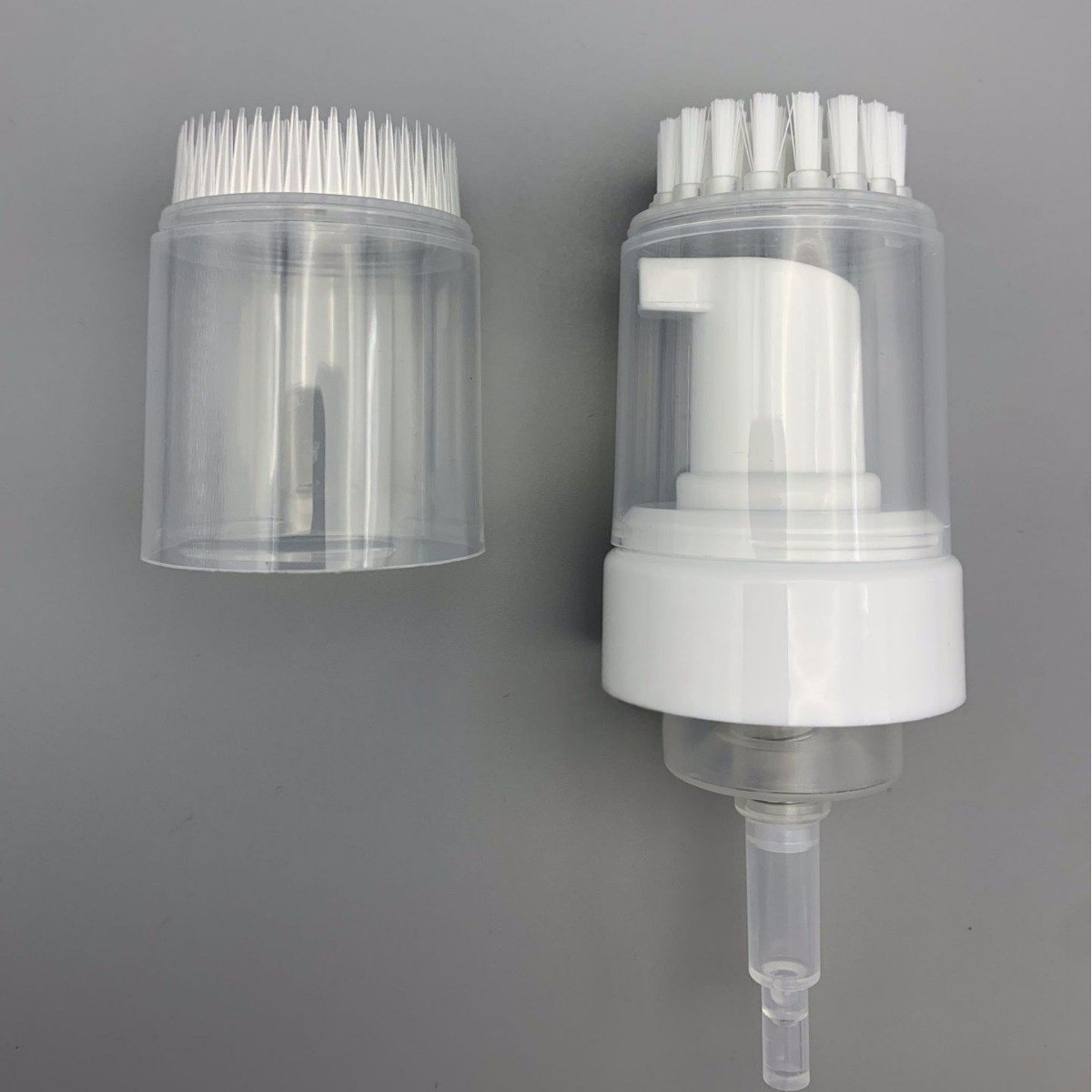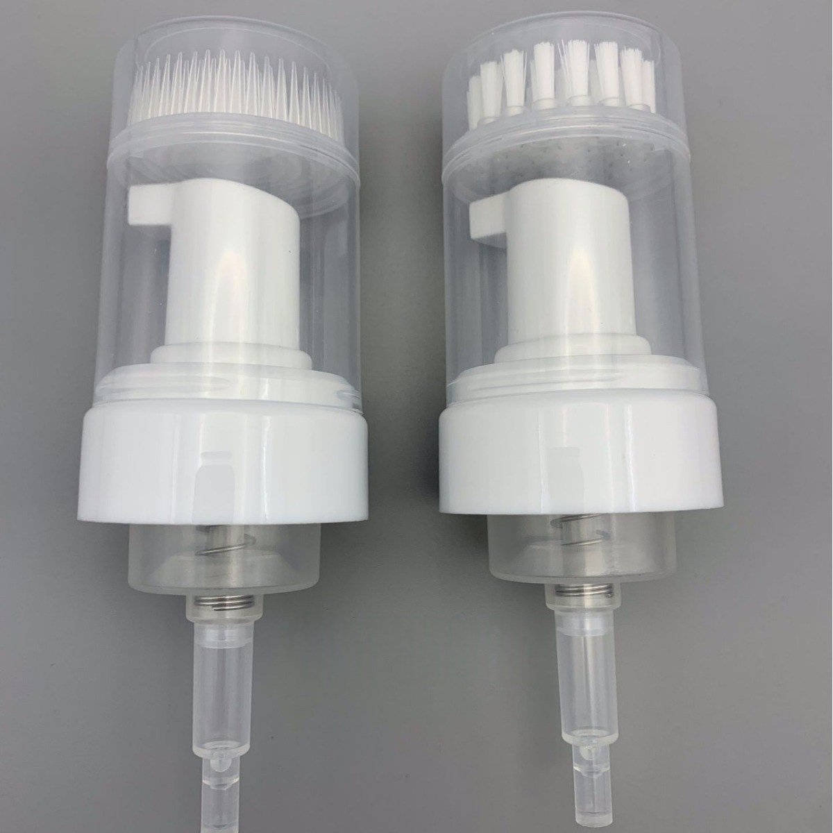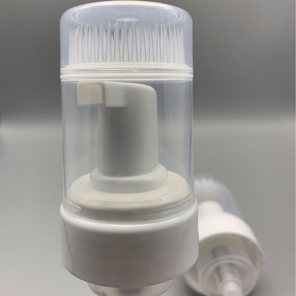 foam pump for facial cleansing mousse with a silicone soft brush head and a cover suitable for down filled clothes and shoes